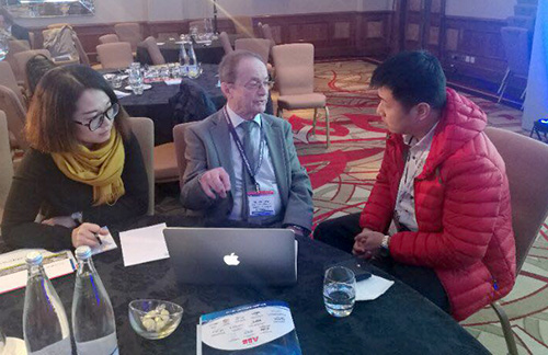 水联网公司总经理周晨*生在现场就漏损管理问题与英国控漏专家Malcolm Farley*生进行交谈